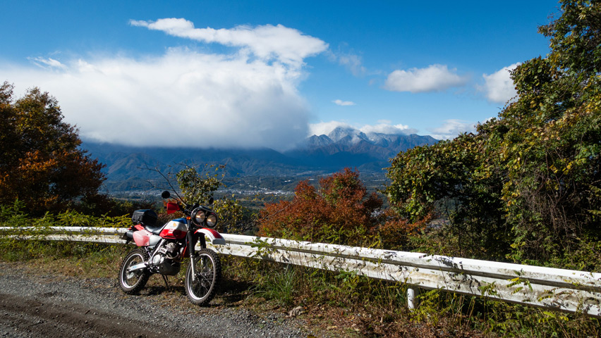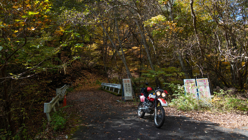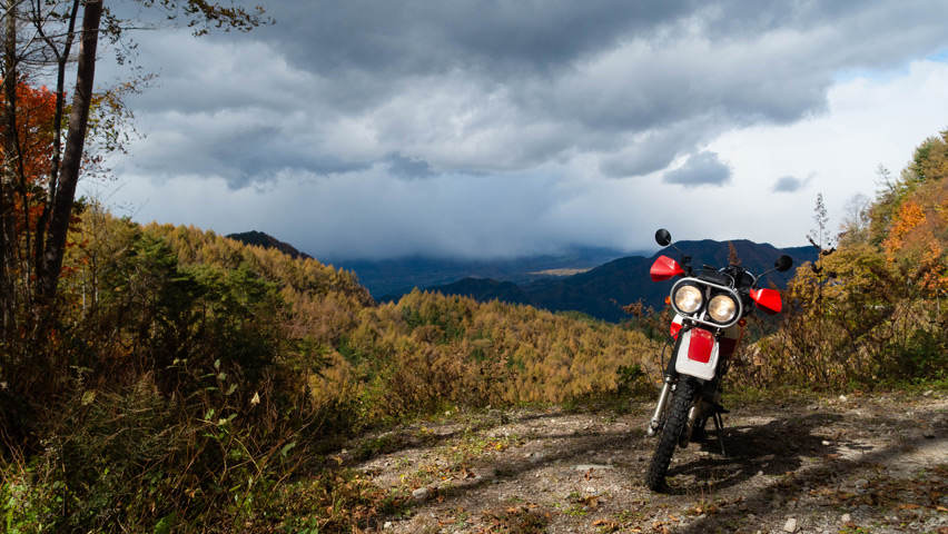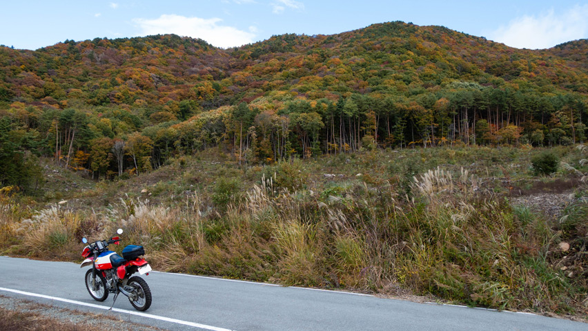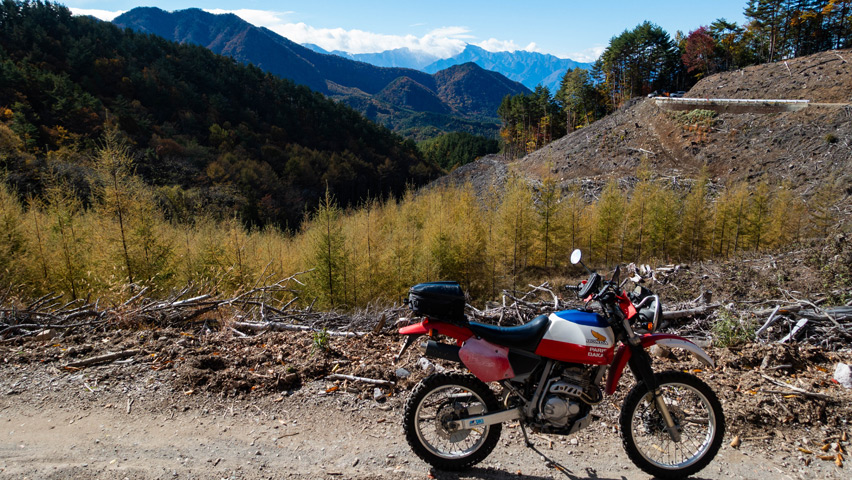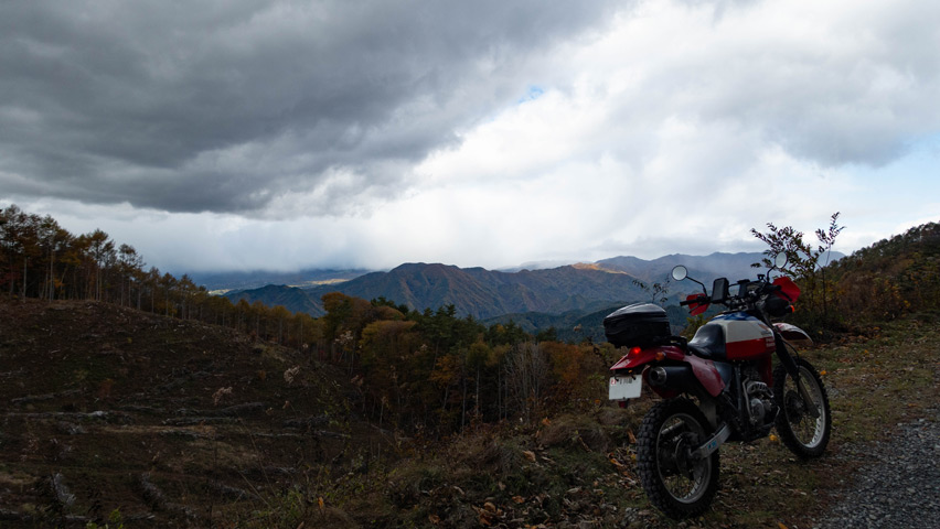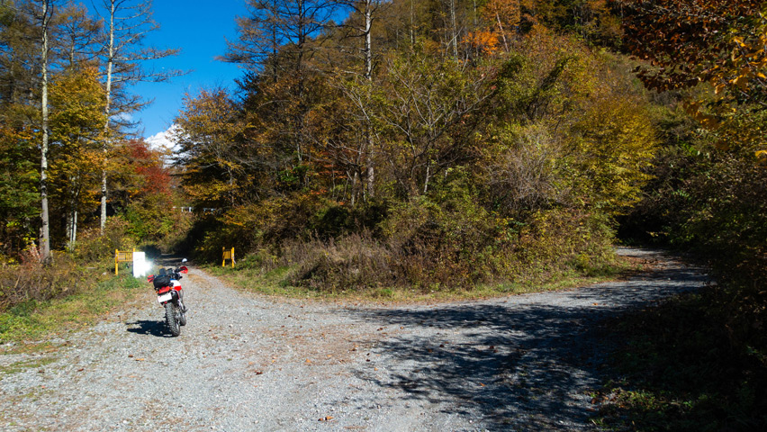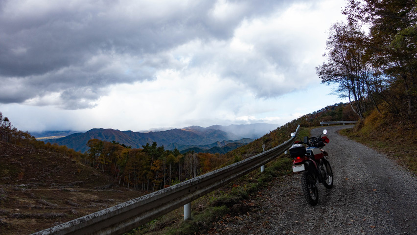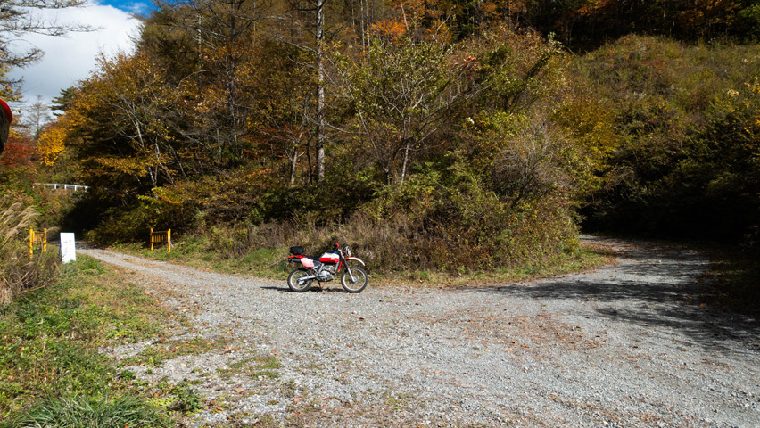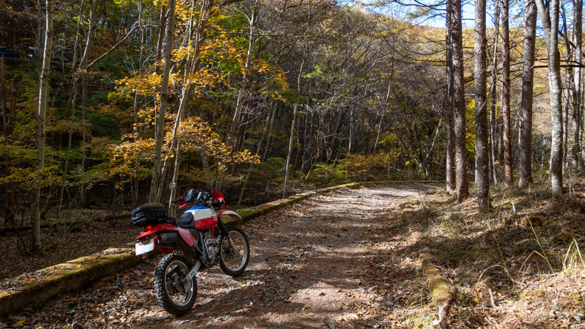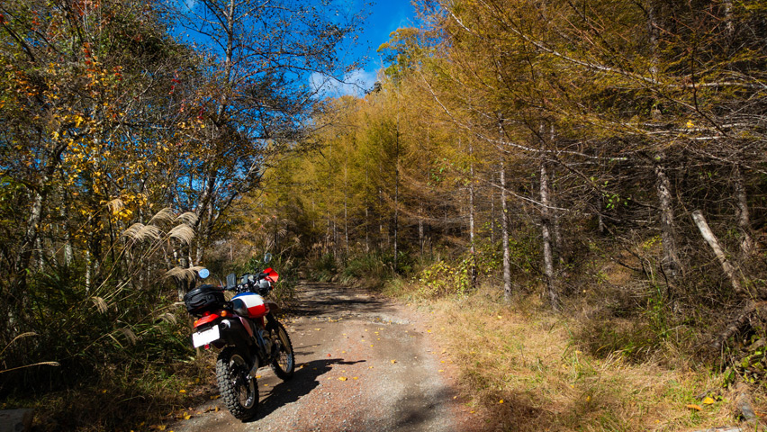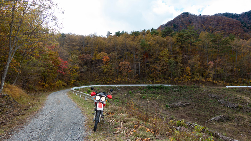BAJAから折りて写真を撮りがてら、深まりゆく秋と冬の始まりの交じり合ったこの景色をしばし眺める。いまこの瞬間、この景色のなかに佇んでいられることがたまらなく嬉しい。やっぱり俺には林道がないと駄目なんだよなあ。