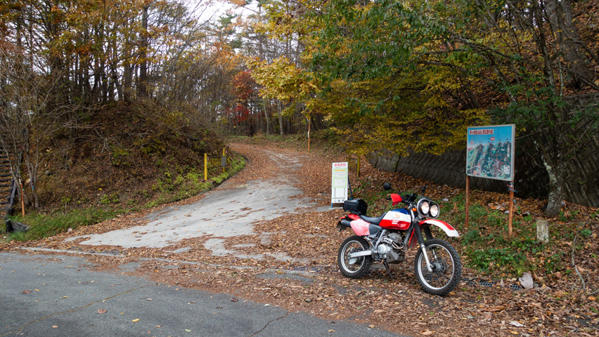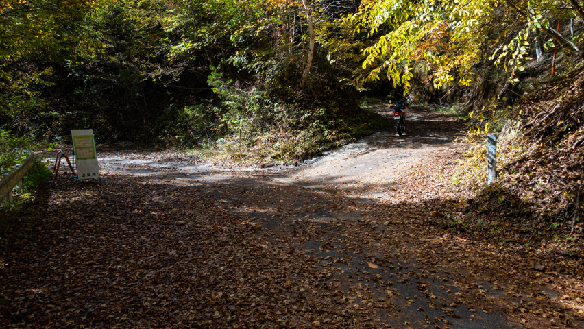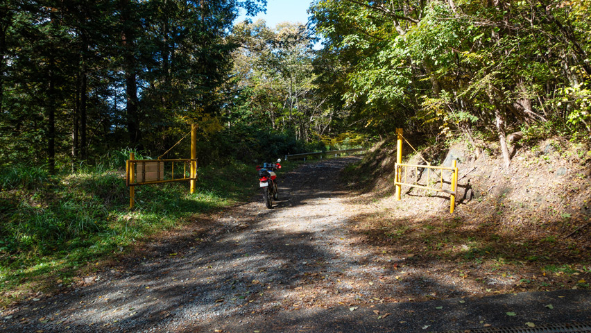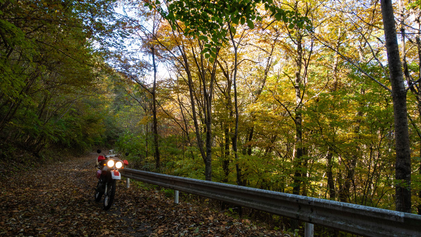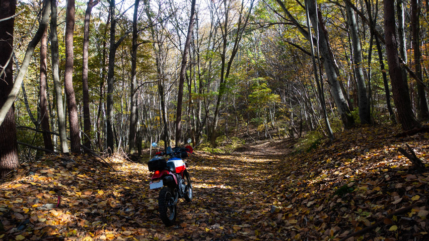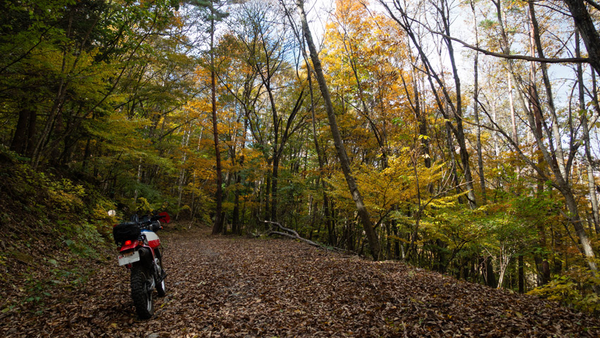 道が林間に吸い込まれると、路上一面を落ち葉が覆いつくしている。青空の下で遠くを見晴らせる景色も良いが、こうしたしっとりとした穏やかな風景もまた林道の良さのひとつだ。