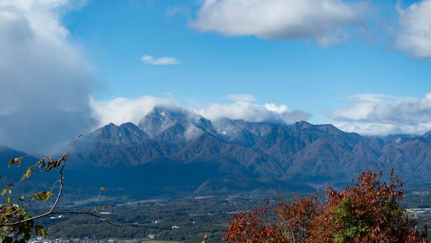 今日は稜線に沿うように、部分的に雲に覆われているが、この景色もなかなか綺麗で素敵じゃないか。それに、山頂付近にはもう雪を纏い始めているようだ。本当にこの時期の季節の移り変わりは忙しないねえ・・・。