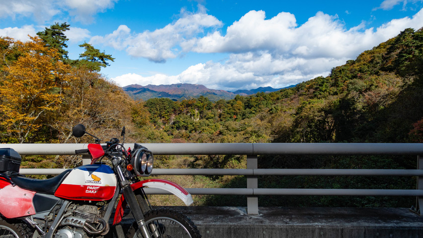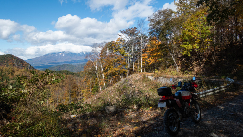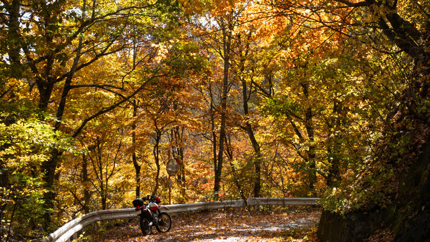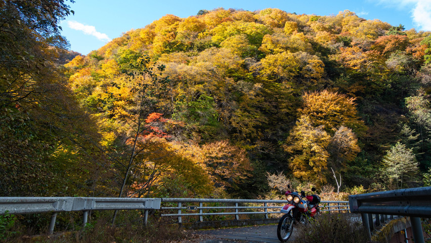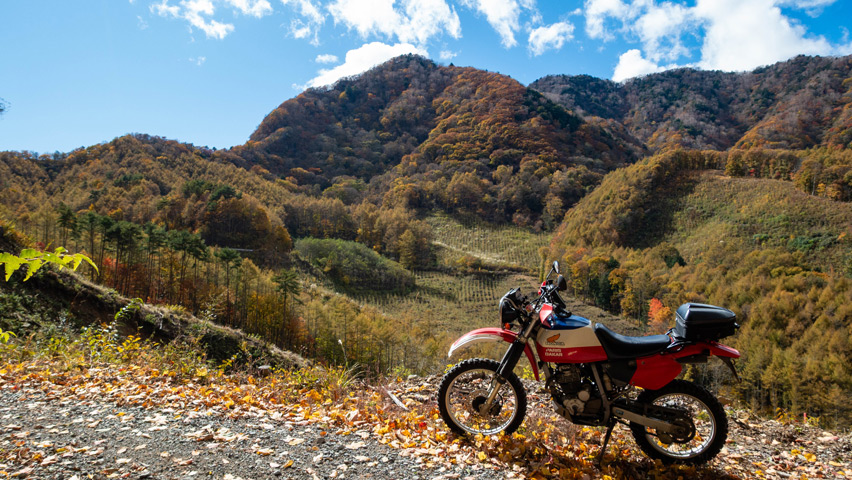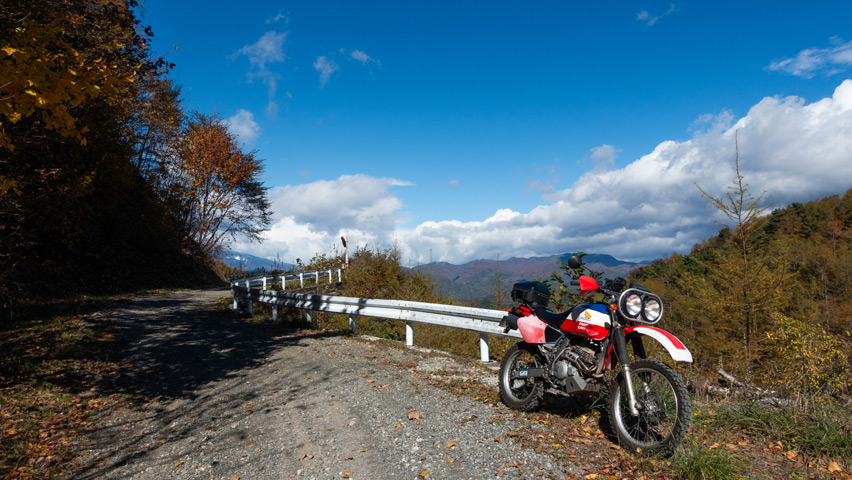 観音峠大野山線を走行していると、空からは再び陽が差しはじめ、道を囲む紅葉が鮮やかに輝いていた。舗装林道とはいえ、秋の色に包まれた景色の中を走っていくのは無上の喜びだ。