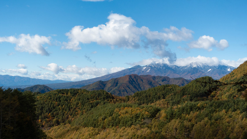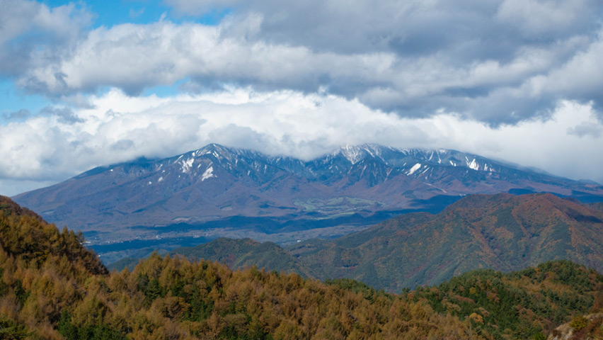 山頂を覆うように青空に浮かぶ白い雲と、青みを帯びた山肌の襞に沿うように積もる白い雪。紅葉の山並みの向こうに聳えるこの景色、最高だ・・・。やはり今日は目的地を変えて正解だったな。