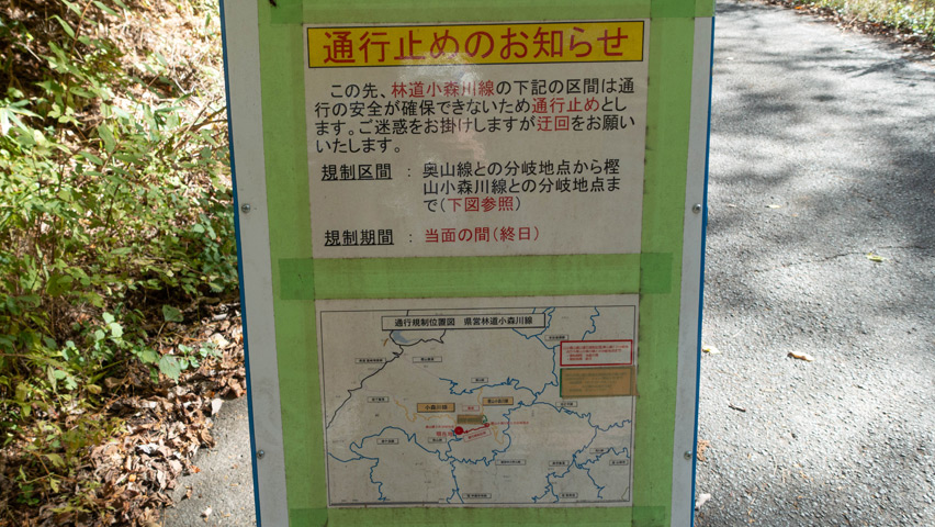 思いがけず爽快に開けた景色を楽しめた樫山小森川線もここで終了。続いて、ここから北上し少し離れた林道へと向かう。そちらの紅葉具合はどんな感じだろうか。