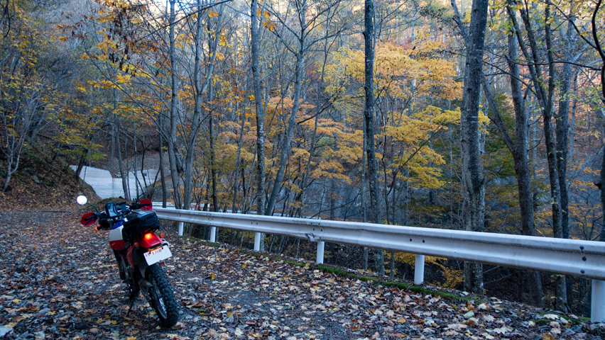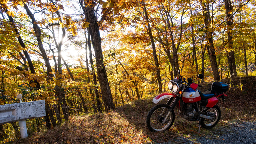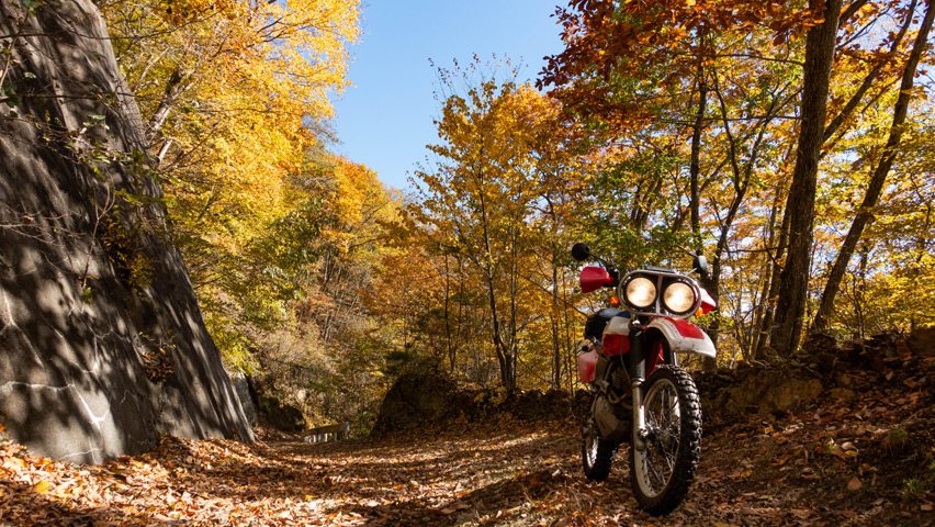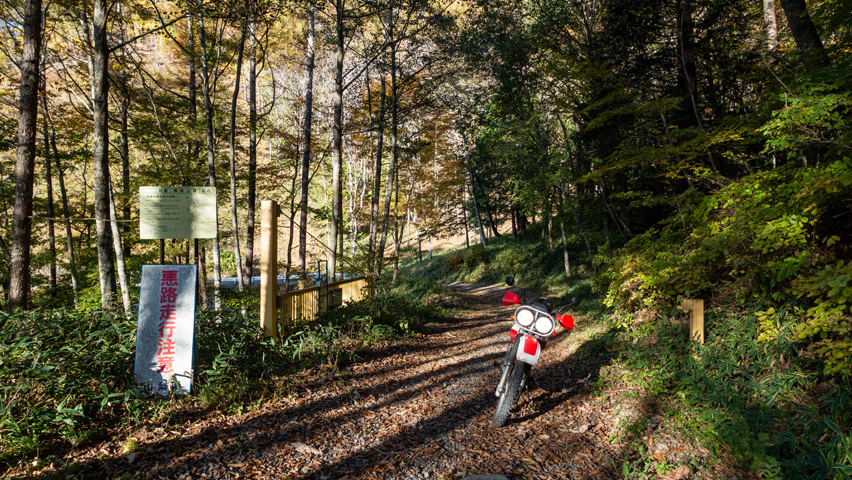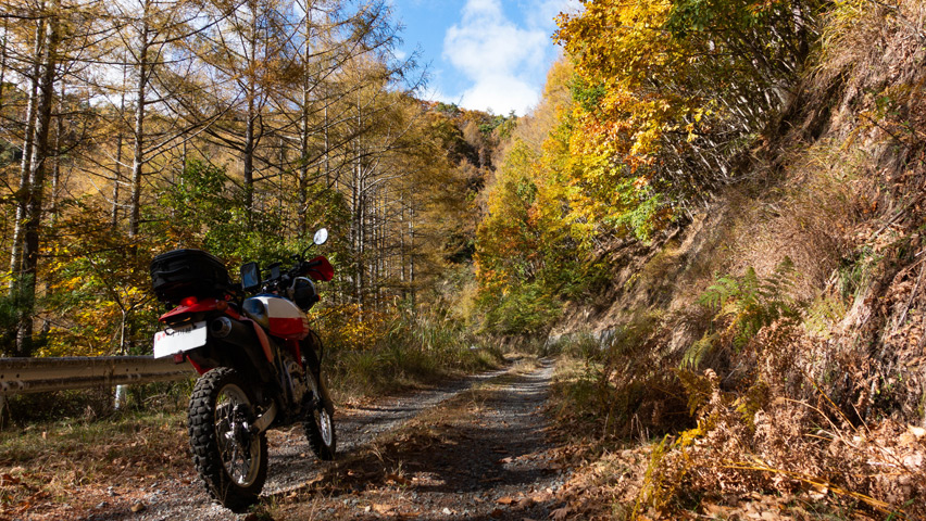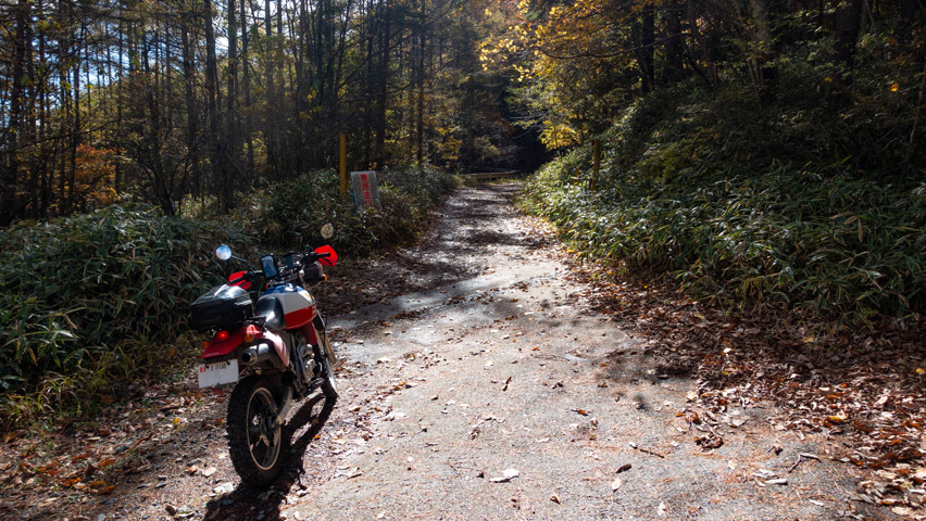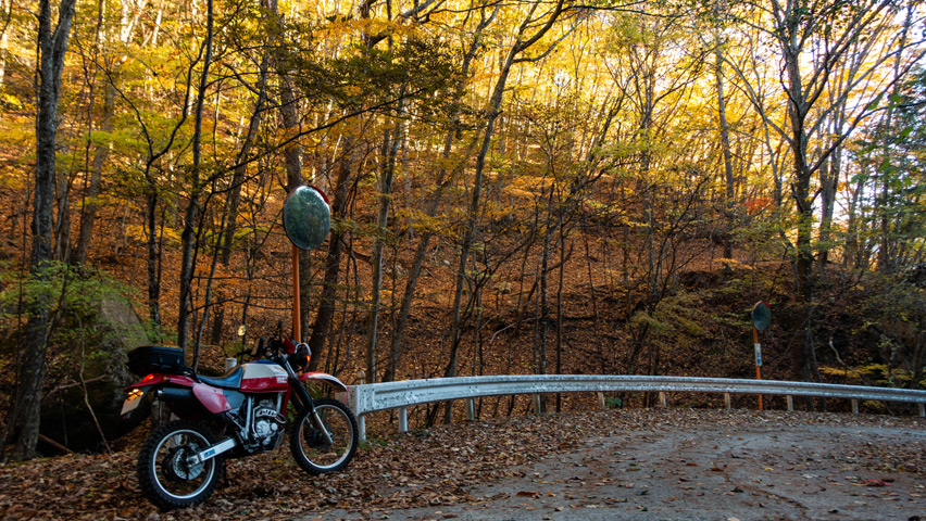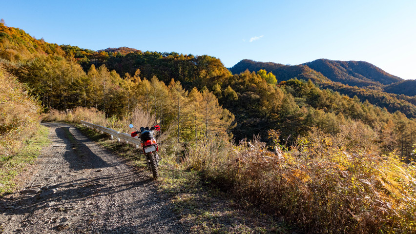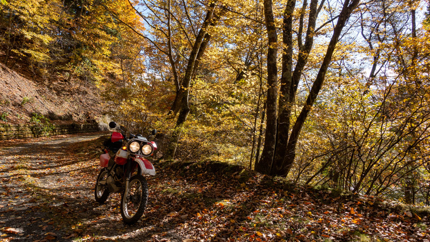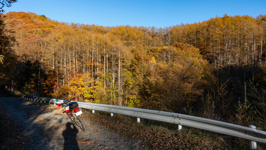 最高だ・・・金ヶ岳線からさらに北上したおかげで紅葉の色づきも今日一鮮やかで、秋の林道を走る喜びってこれだよなあ、と改めて実感しながらのんびりと路面を踏みしめる。