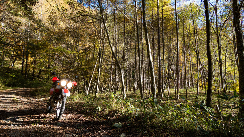 路上に落ちる木々の影の中を走っていくと、その光と影がチカチカと明滅し網膜を撫でていく。これもこの季節の林道の楽しさだ。