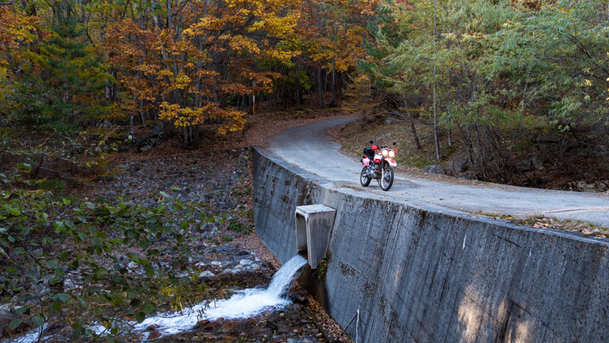 路面が舗装に変わってしばらくしたところに、堰堤の天端が道を兼ねる地点があった。ここも、水量が増えた時には洗い越しのような効果を発揮するのだと思うが、それは相当の雨量のときだろうな・・・。