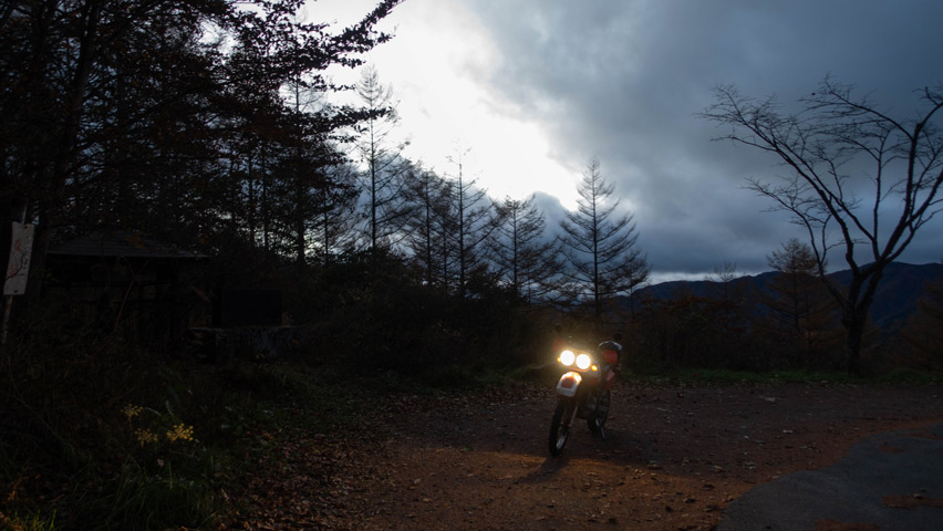 空には徐々に雲が広がっていき、次第に闇に包まれゆくぶどう峠は、バイクはおろか車すら通らず、ヘッドライトが照らす範囲だけの視界を頼りに進んでいく、まさに苦行のような行程だったが、もはや俺も変なテンションになっていて、そんなことにすら楽しさを感じていた(笑)。