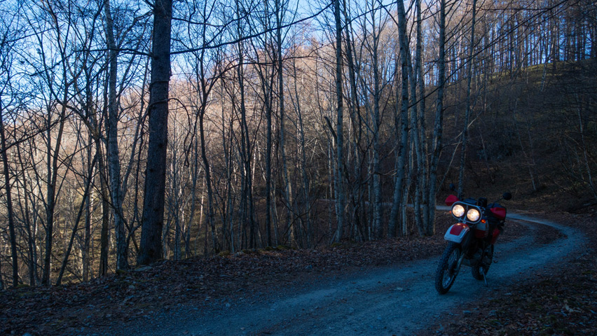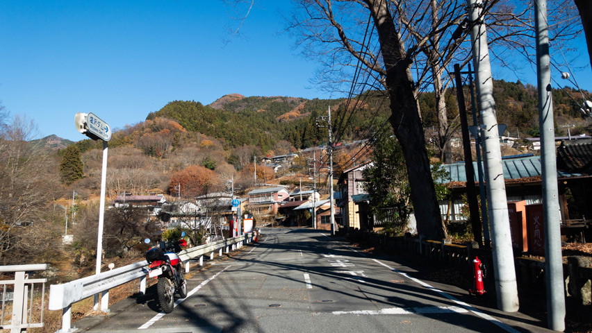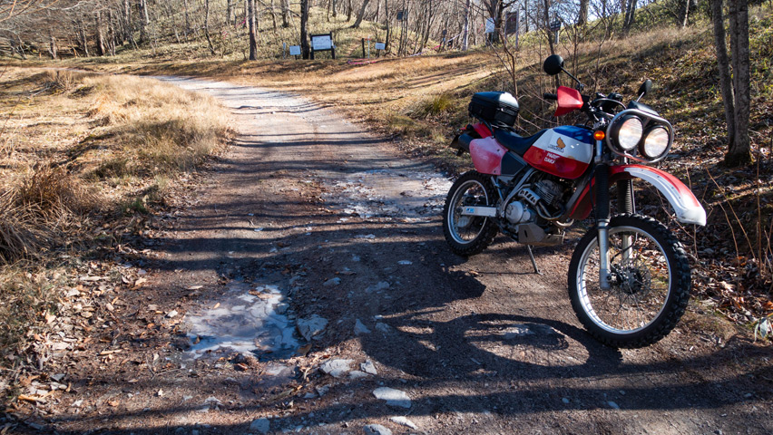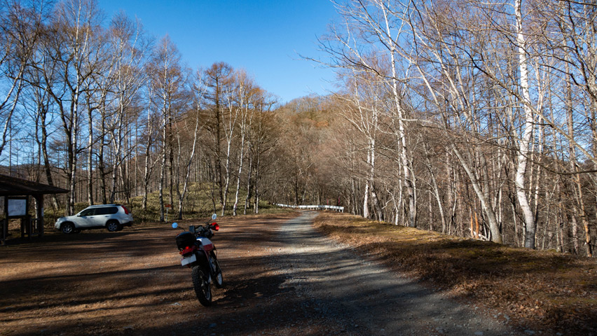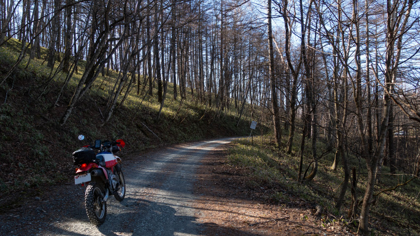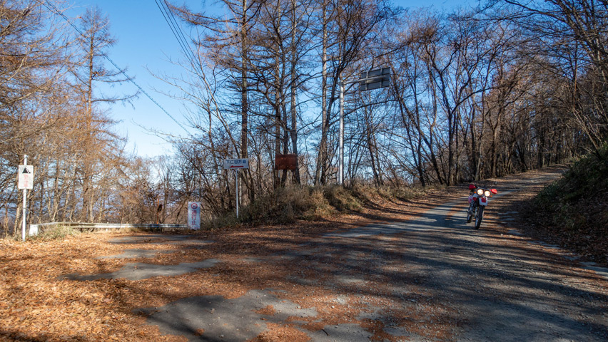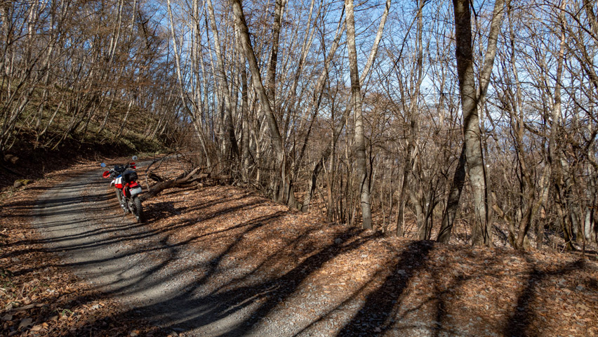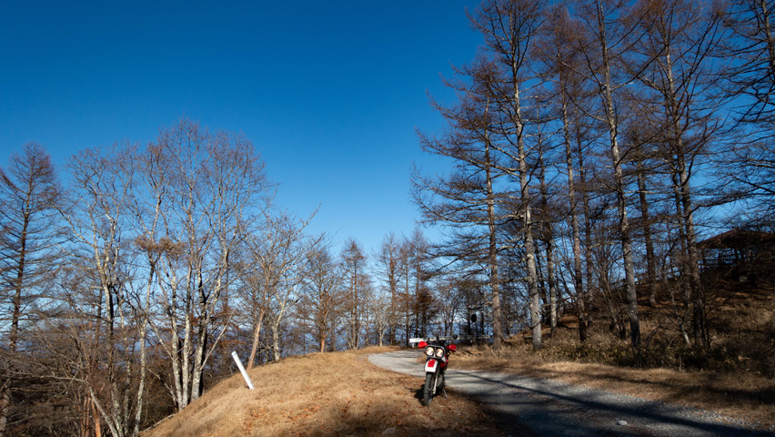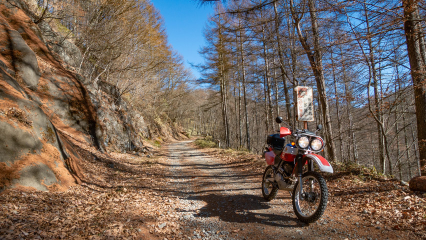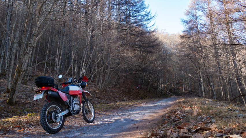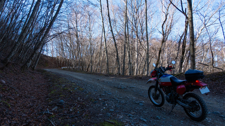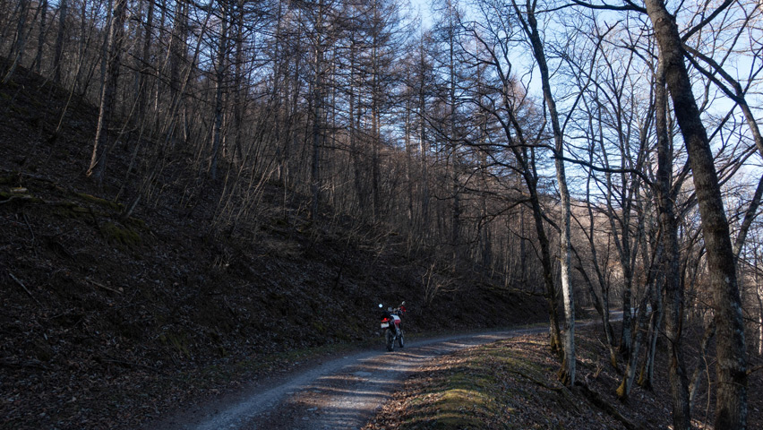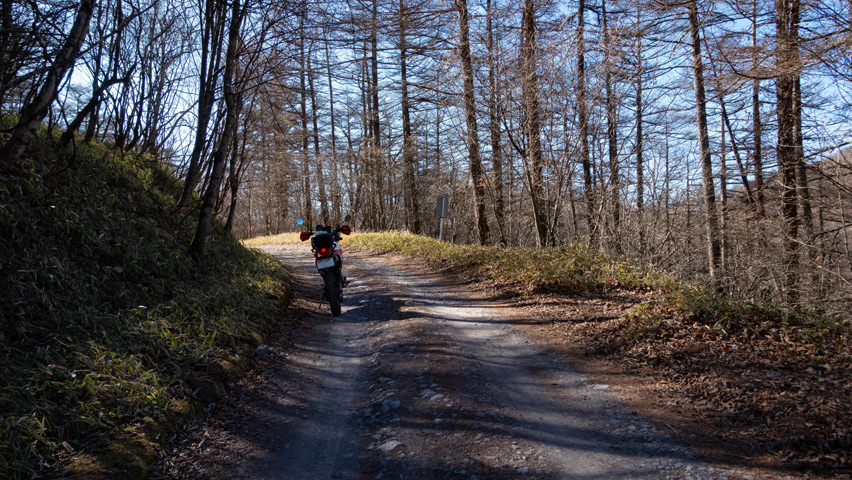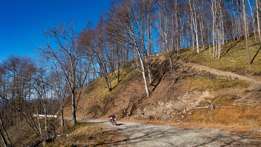 落葉し切った木々の向こうに広がる青空、そして路面を覆う落ち葉の暖かな色彩が、この季節の林道を走る喜びを早々に見せつけてくる。この、坂を上っていくストレートはどうしたって目に留まるので、毎回同じところで写真を撮ってしまう。