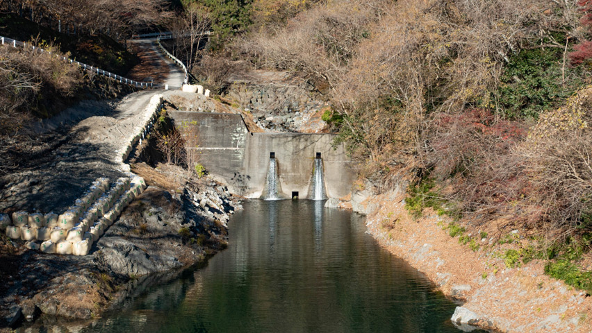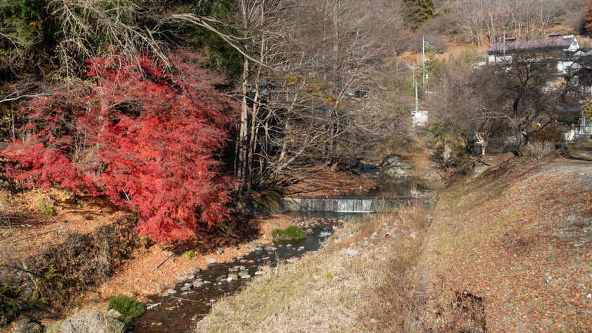 国道との分岐地点にBAJAを停めて写真を撮っていると、その脇を流れる川にある堰が目に入った。その脇で彩を添える紅葉との組み合わせが素晴らしいね!一見すると地味な眺めかもしれないが、この良さにどれだけの人が共感してくれるだろうか(笑)。