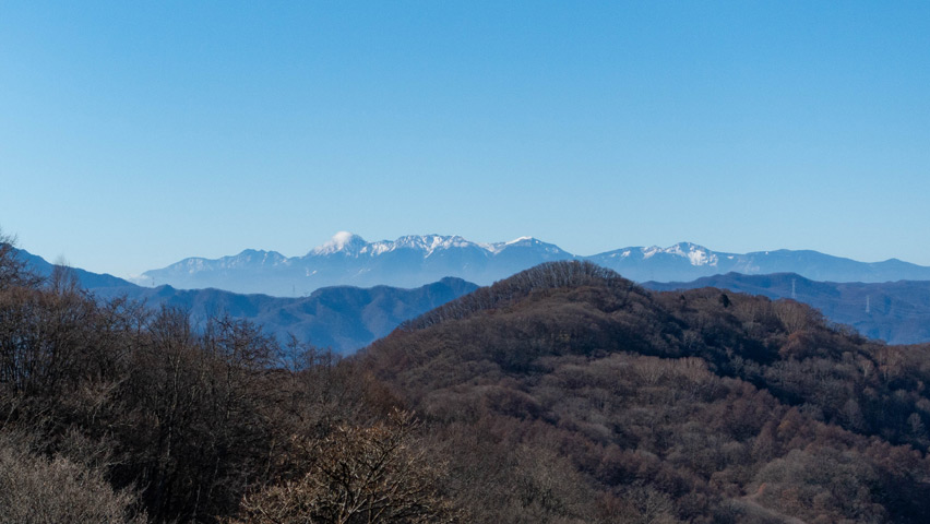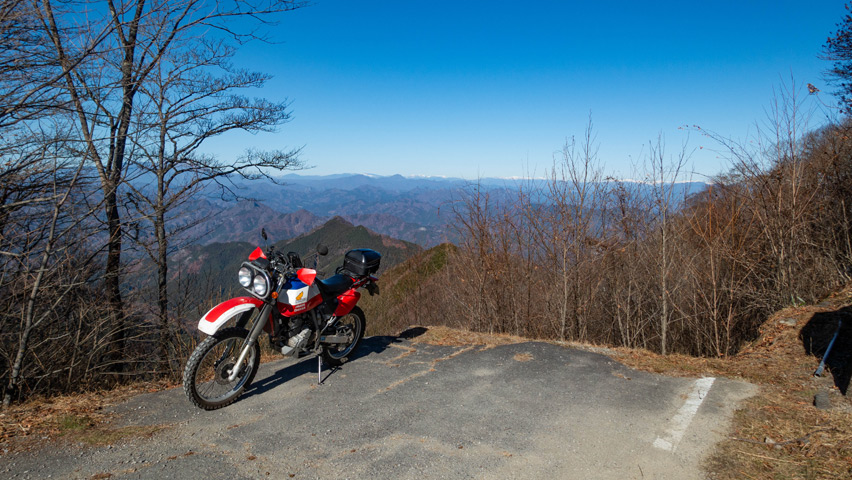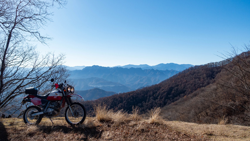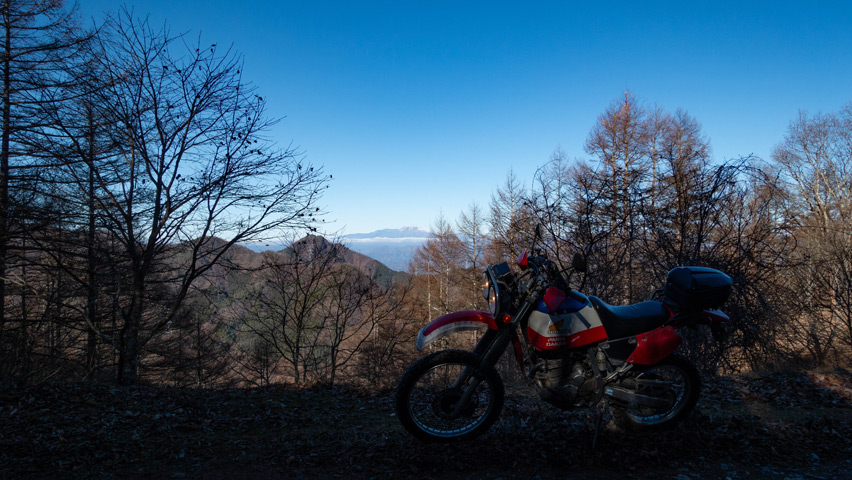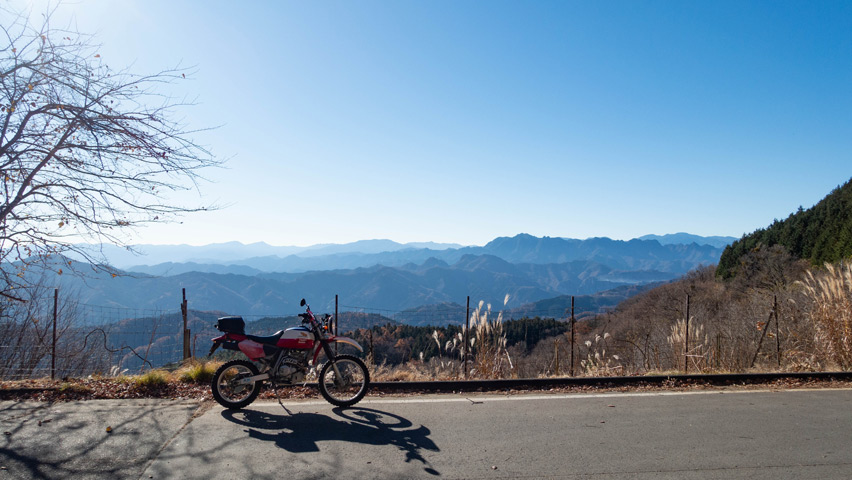 そして一気に塩沢峠まで上がってきた。澄んだ空気の中に浮かぶ、遥か遠くまで連なる山々の淡いグラデーションがこの季節の醍醐味だよ。