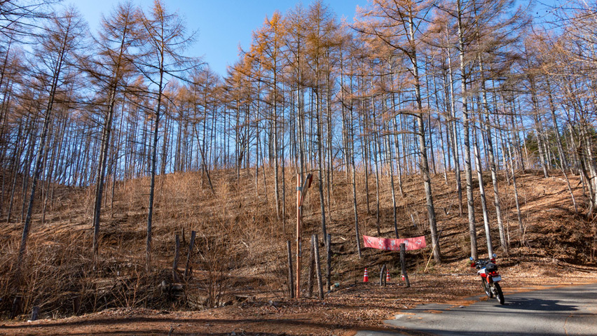 その先で、稜線近くの斜面に広がるカラマツ林があった。黄葉はもう最終盤で、葉もかなり落ちていたが、路上から見上げる、青空を透かすカラマツ林に包み込まれるような感覚に惹かれ、思わず立ち止まった。