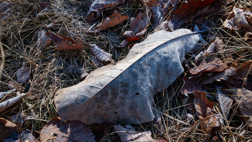 ふと足元の落ち葉を見ると、その表面には霜が降り、きらきらと光を反射していた。また12月にも入っていないが、この標高だともうすっかり冬なんだよなあ。