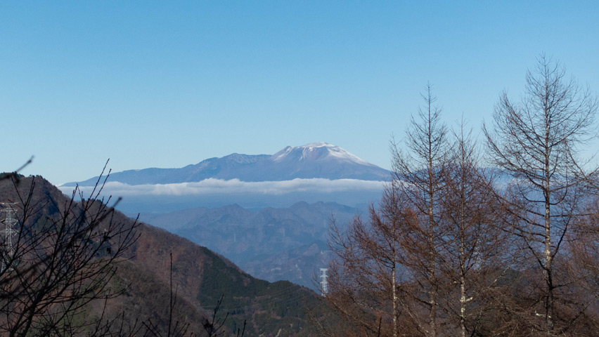 その少し先の日陰に入り、木々が僅かに途切れた地点からは、遠くに浅間山の姿が見える。