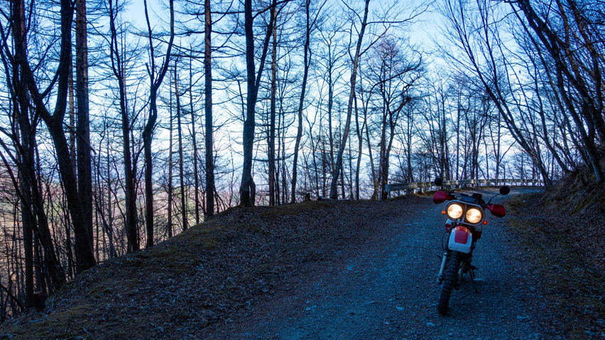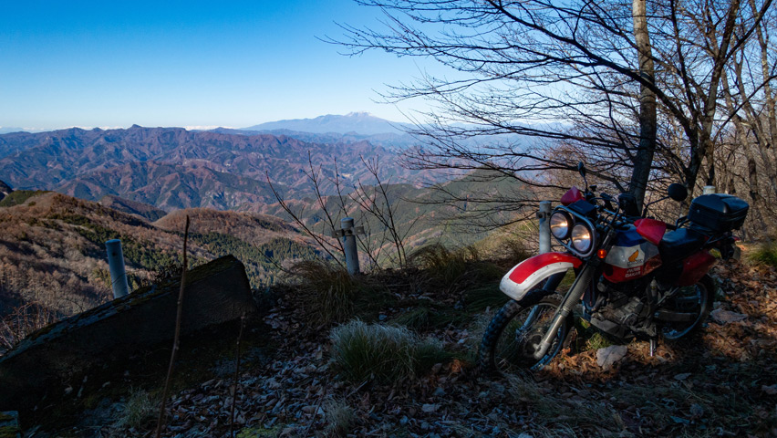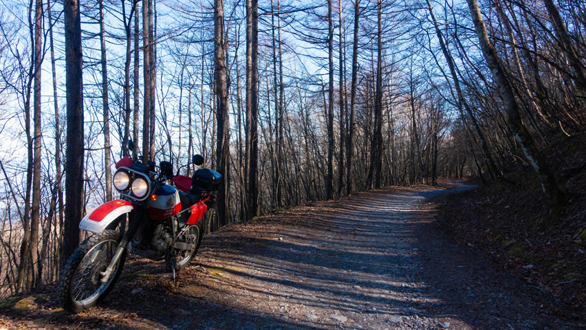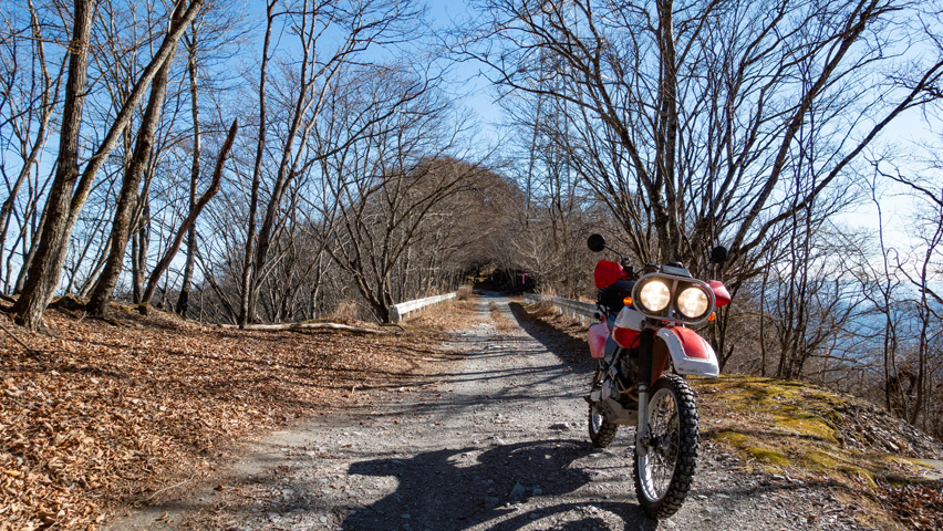 同じ林道を走っても、季節によって全く異なる景色になり、その時々でそれぞれの美しい景色を見せてくれるが、この御荷鉾は、特に冬枯れた景色に強く惹かれてしまう。それは、稜線近くを延びるために、木々を透かして空を近くに感じられることも大きな要因だと思う。