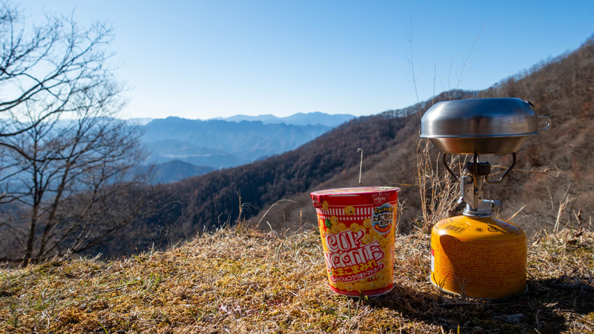 で、しばらくここに人の来る気配もなかったので、さっそく本日1回目の山ラータイムだ!わずかにそよぐ風の音だけが聴こえる中、こんな景色を眺めながらの山ラーはやはり最高なのだ。