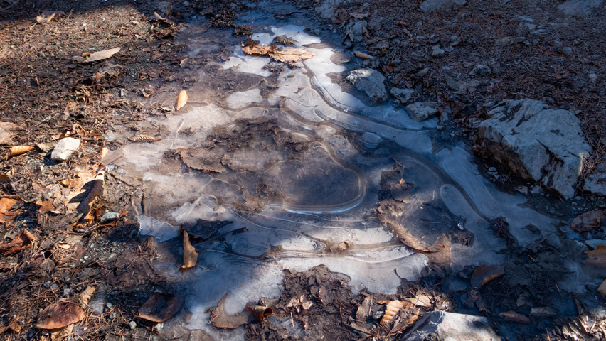 やっぱり!その表面はしっかりと凍りついていた。しつこいくらい言うけど、今年はいつまでも暑いという印象があったけど、さすがにこういう光景を見ると季節はちゃんと移り変わるものだということを実感するよね(笑)。