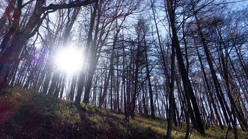日陰の中で立ち並ぶ木々の向こうに、日向の明るい景色が透けて見えている。冬ならではのこの景色だ。