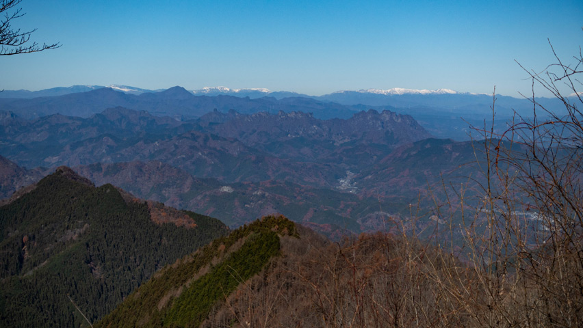 そのまま日陰の区間に入ると、周囲の景色は影の中で青みを帯び、路肩の木々は冬枯れたそのシルエットを青空に浮かび上がらせる。これもまた冬の御荷鉾の醍醐味だ。