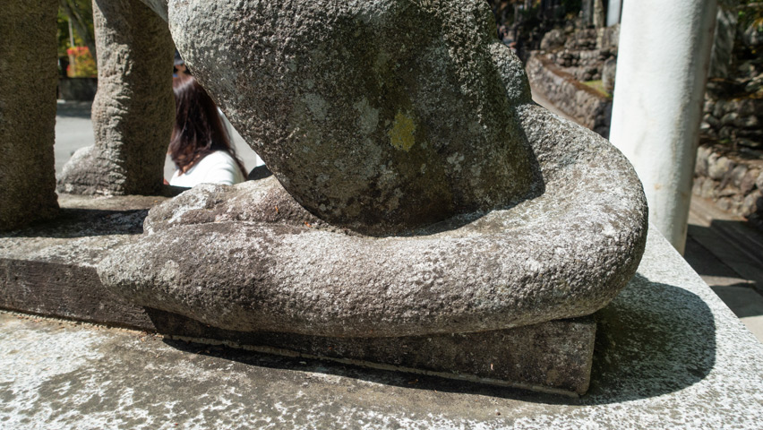 頭部のアップ。石工の想像力に全振りしたと思われるデザインが素敵です。釜山神社のものは口の中が紅く塗られていましたが、こちらは風雨で剥がれてしまったのか、その痕跡は見られませんでした。