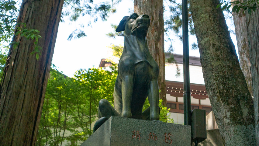 青銅両部鳥居に至る階段を挟むように、1対のお犬さまがいます。