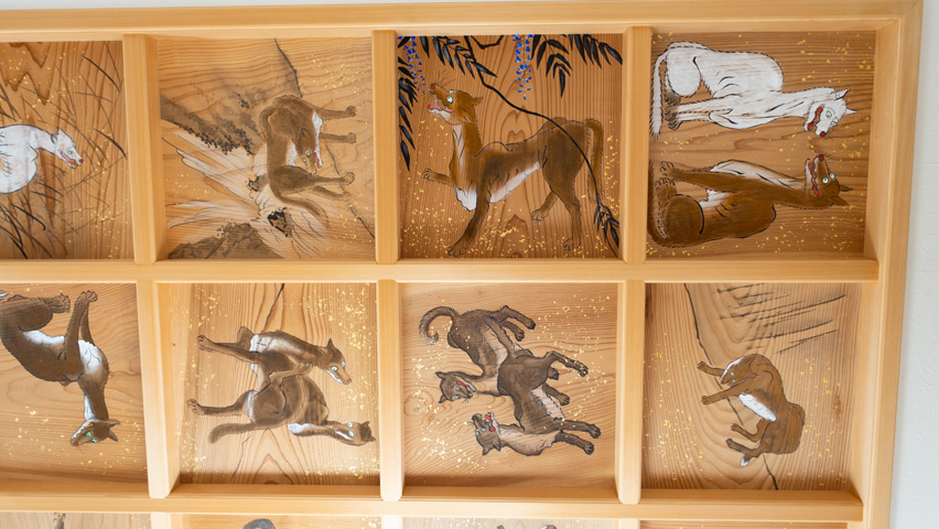 オリジナルの天井絵は1905年(1904年とも)に奉納されたとのことですが、この天井絵も、息遣いすら感じるほどに躍動感のあるオオカミたちの姿が忠実に復元されています。