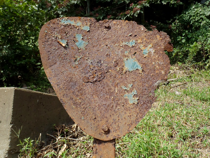 | 表面からは気付きませんでしたが、全体的にかなり錆が進行していて、標識に穴が開いてしまっています。 また、縁も痛みが激しく輪郭が崩れています。 |