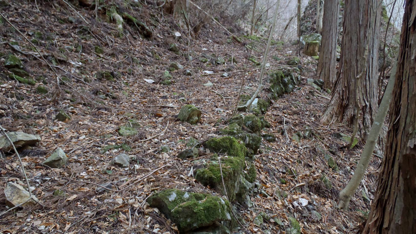 その石垣の上を辿ってみる。ほぼ全ての路盤は土砂で埋もれ斜面と同化している。