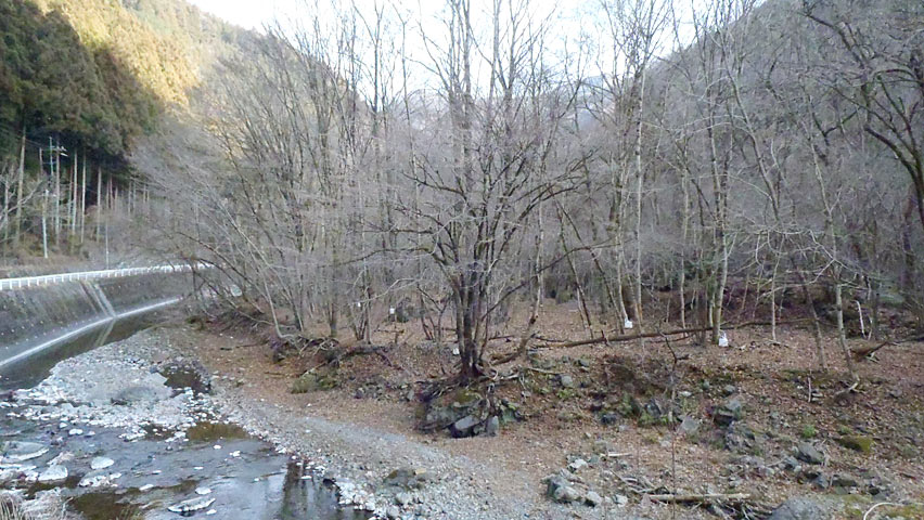先ほどの吊り橋跡から1km程下って来た。この辺りで軌道は県道側の左岸へと渡っていたようなのだが、この前後はかなりしっかりとした護岸が造られ、軌道の痕跡を見ることは出来ない。