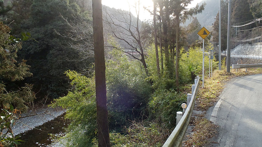 ここがその架橋地点。今では橋の痕跡は全く残っていないが、路肩に突き出た部分が橋台となっていたのだろう。