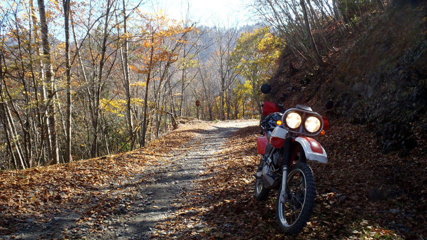 奥秩父林道の分岐から立体交差へと向かうカーブの路上にて。車両が通らないので路面を覆い尽くしたままの一面の落ち葉が素晴らしく綺麗だ。