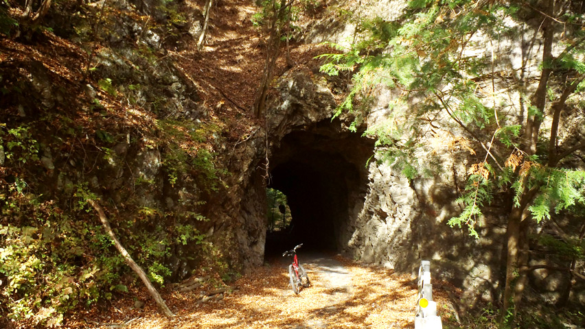 この遥か下に、砂防堰堤の続く谷があります。ここを自転車で下っていくのは結構緊張します・・・。