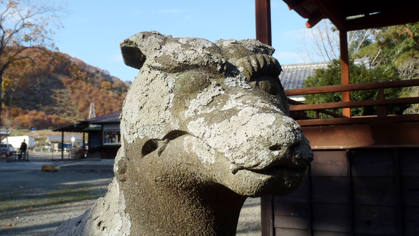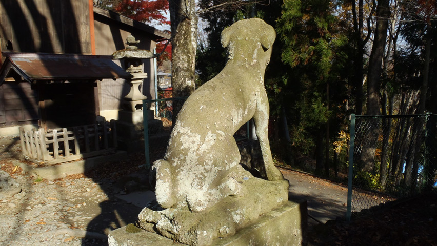 岩根神社の狛オオカミの身体。顔つきはコミカルながら、ニホンオオカミ特有の痩身体型は良く表現されています。