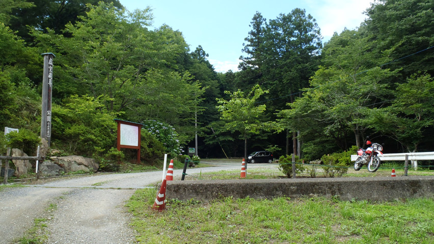 その1号柳田堰堤の上に位置する、虚空蔵尊さくら公園の駐車場。この日、公園の利用者はいないようでしたが、駐車場に停めた車で寛いでいるおじさんだけがいました。