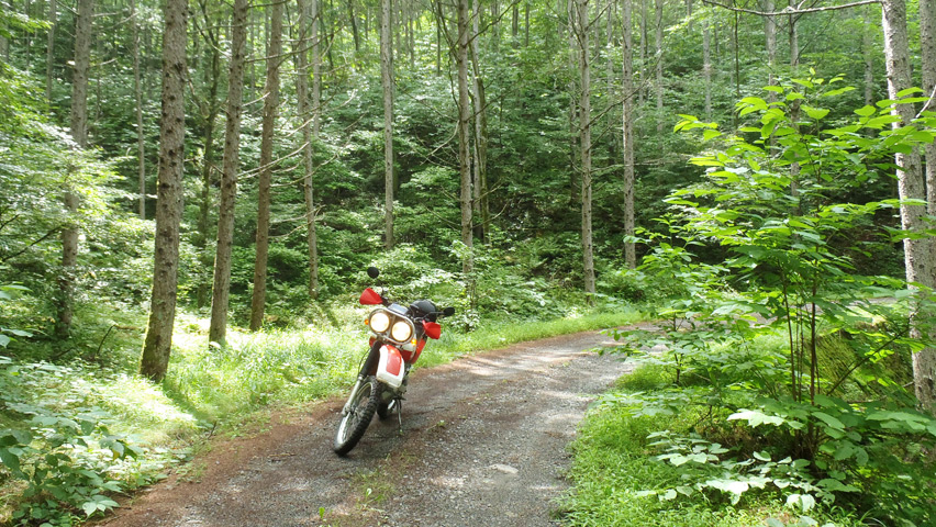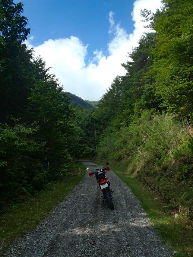 茅ヶ岳林道の景色。こんな感じの鬱蒼とした景色が続きます。所々荒れた箇所もありますが、概ね走り易いです。