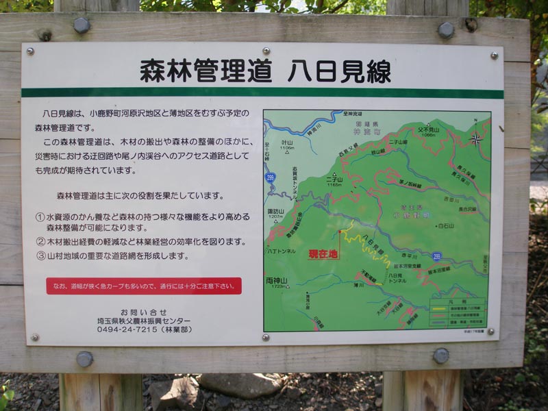 河原沢地区の国道299号から分岐する起点側区間と、両神薄地区の県道279号線から分岐する終点側区間を結ぶ予定の林道で、現在開設中です。