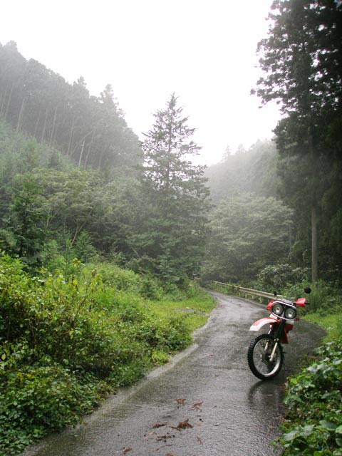 木々の葉からぼたぼた落ちてくる雨の雫をうけながら、やや荒れた道を走り抜けて峠の終点へ。