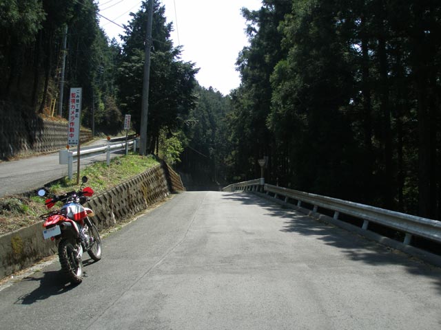 ここも標識は立っていないのだが、以前に一度だけ走った感じでは林道なのは間違い無さそう。起点付近のみ舗装された道を上がっていくと、奥から歩いて降りてきたハイカーらしきおじさんがこちらに向かって腕をクロスさせて×印をしてきた。バイクを停めると、「この先は行けないよ」とのこと。ようはこの先で行き止まりになるから行っても無駄だよ、ってことを言いたかったらしい。そのおじさんに「行き止まりですよね?大丈夫、知ってます!」と言って先へと進む。行き止まりで何が大丈夫なんだよ、変なやつだと思ったかもなぁ。