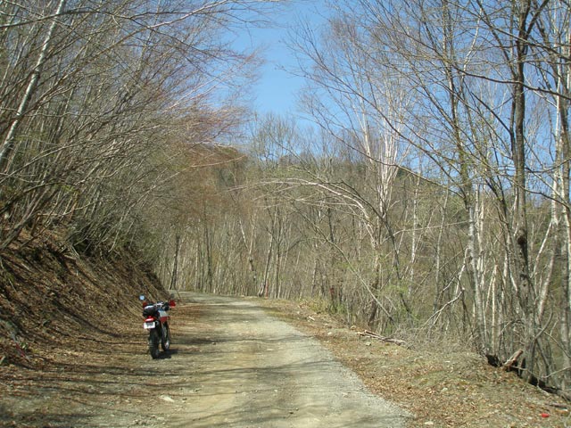初めのうちは、やや鬱蒼とした林の中を、いくつのもコーナーを経て一気に高度を上げていく。飯能辺りのショートピストン林道とは明らかに違うこの雰囲気、とてもワクワクします(笑)。しばらく進むと、徐々に道の勾配も緩やかになり視界も開けてくる。雲ひとつない青空の下、未舗装の林道を走るのって、なんでこんなに気持ちいいんだろう?昨日の悪天候の中、無理して出てこないでよかった(笑)。