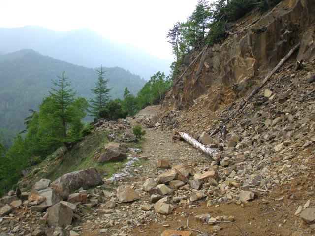 木陰でカッパを着込み、さらに先へと進む。途中、一頭の鹿が目の前を横切り、谷側へと走り去っていった。驚かせてごめんよ。