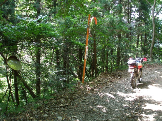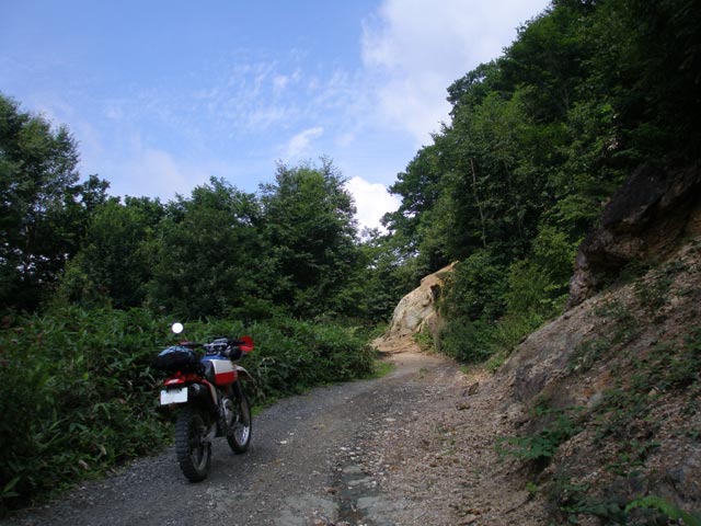 しばらく進んで行くと、突然路面が未舗装に変わったが、幅員も狭く、やたらと鬱蒼としている。まだここでいいのか疑い中・・・。もう少し進んだ先で、二人連れのオフ車の方が休憩していたので、「秋鹿大影林道ってここでいいんですかねー?」と声を掛けると、自分達も初めて来たのだけど、たぶんここでいいんじゃないか、とのこと。結局はっきりしないまま、違ってたら戻ればいいかと思い更に先へと進んで行く。