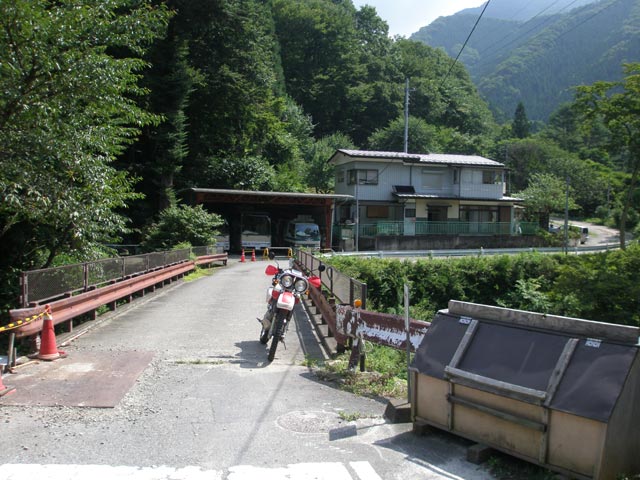 そんな景色の中を気分よく進んで行くと、突然、道が二股に分かれる地点に出た。えっ、これ、どっちへ進めばいいんだ?右は沢沿いに進み、左は橋を渡っている。地図を見てもそれらしい分岐が記載されてはいないのだが、沢を跨いでいるような箇所はあるので恐らく左でいいんだと思うけど。と思っていたら、少し手前に立っていた看板にそれらしいことが書いてあった。やっぱり左でいいようだ。エンジンを掛けて出発しようとすると、右方向の奥から、先ほどの二人組みが戻ってきた。どうやら行き止まりだったらしい・・・。