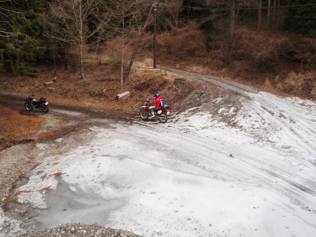 しばらくとろとろと走っていたが、やがてピークは超えたようで、道が下りになると、路面の雪もなくなってきてとりあえず一安心。やっぱり舗装路の積雪が一番怖いね。何が怖いって、こんなところでツルンコしたら確実にライトガードをやられるのを、2人とも一番恐れています(笑)。