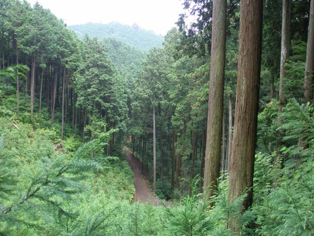 間野線を抜け、隣に起点のある林道阿寺線の起点に生えた大木の下で雨宿りをしていると、次第に雨脚が強くなってきた。合羽を着こみ、この後どうしようか考える。もう帰ろうかとも思ったが、少し待ってみると、雨脚も弱まってきたようなので、このまま阿寺線を抜けて、鎌北湖のほうへ向かうことにしよう。