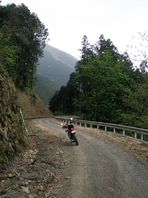 | ただ、所々でガードレールにピンクのテープが巻きつけてあるのが気になった。路面に打ち付けてあるわけではないので、すぐに舗装されるということはないだろうが、ここもダートを楽しめるのは今のうちだけかも知れないな・・・。 |
