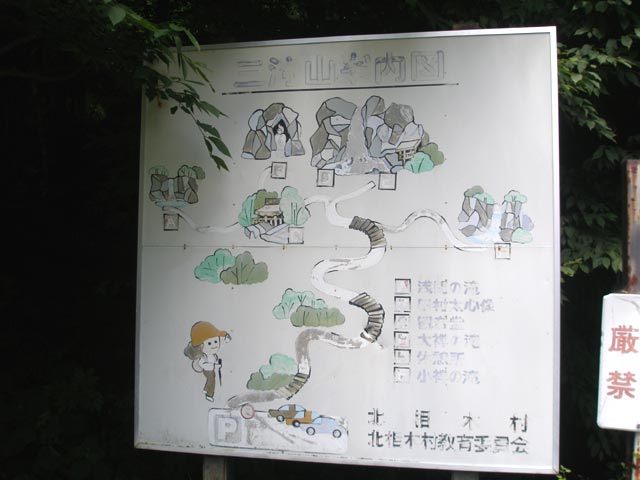 | この先は登山道となっているようで、その為の駐車場でもあるようだが・・・実のところ、ここには1台の車も停まってはいなかった。色褪せた看板が寂しさを際立たせているぜ・・・。 |