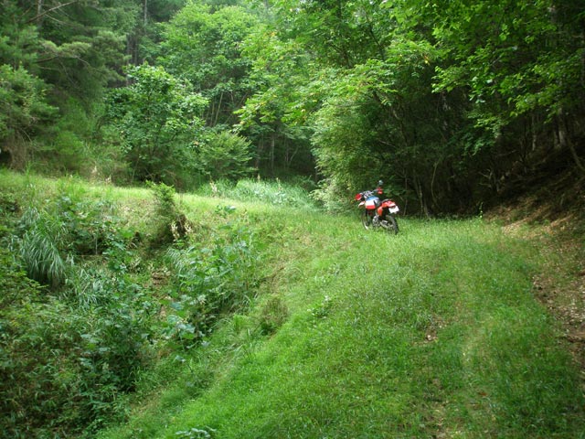 | しばらく恐々と進んでくると、道が左右に分岐する地点に出た。分岐点には特に道案内の類も立っていない・・・うっそ、これどっちに行けばいいの? 慌ててツーリングマップルを開くと、地図上には、確かに双方ダートで分岐する地点が書かれてはいる。ただ、ここがその地点なのかはわからないが・・・。とりあえず地図によれば、右方面は行き止まりのようだ。どうせ行き止まりなら、行き止まるまで進んでみようと思い、下りとなる右手の分岐を進んでみるが、少し進んだだけで、ここもかなりエグい感じに流水痕で荒れた路面となってきたので早々に引き返し、本線と思わしき左手の道を進んでみる。 |