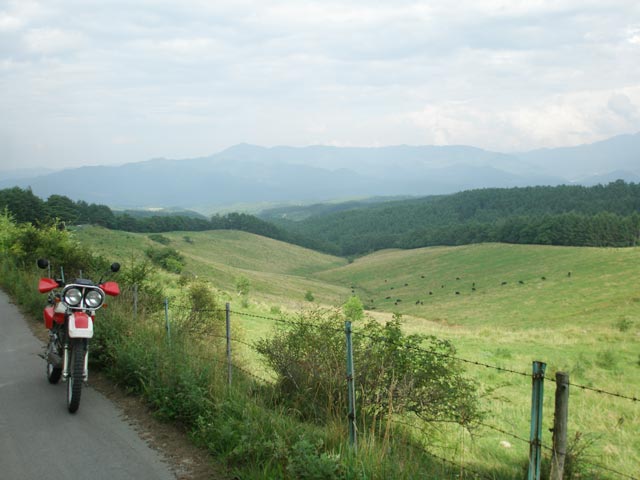 | 道の脇にある牧場は、谷状になった山を拓き、その上で牛がのんびりと草を食んでいる。 |