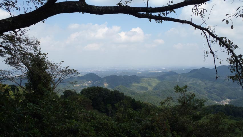 | 道の脇からは、広々とした関東平野が見渡せる。山肌に落ちる雲の影が作るコントラストが素敵。 |