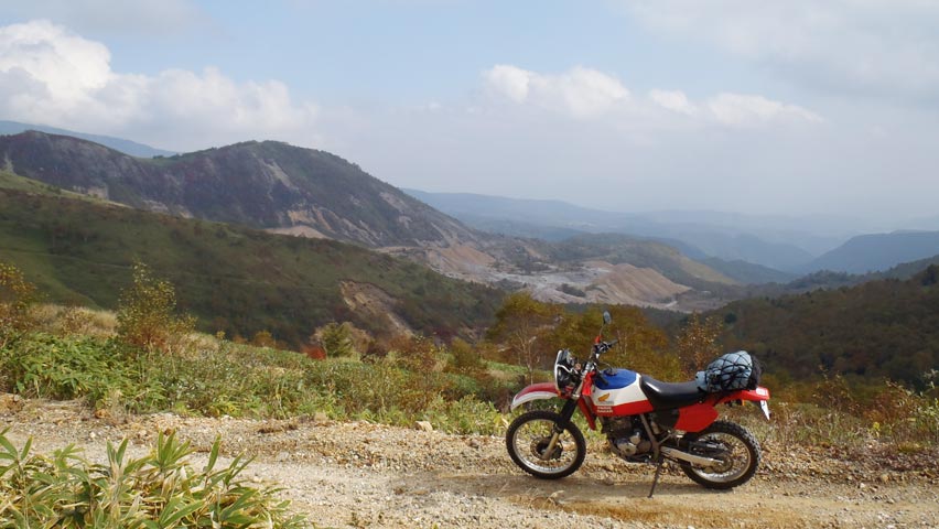 | 鉱山跡の方角を眺めながらゆっくりと下って行く。この辺りで1台の乗用車とすれ違ったのだが、この辺りの幅員がほぼその車1台分しかないので、左側の笹藪の中にBAJAを突っ込んでやり過ごしたが、もしこんな場所で車同士ですれ違うなんてことになったらどうするんだろう? |