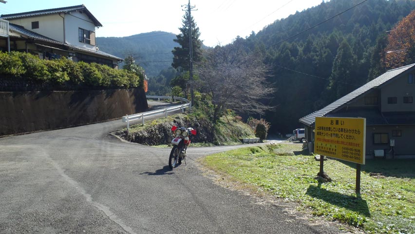 | さて、峯線の終点が接続しているこの道。右手に進めば県道方面に戻るのは分かるが、左手はどこに続いているんだろう。と思っていると、奥から1台の車が走って来た。もしかしてどこかに抜けているのか?ここまで来たから、ついでにその先も確かめてみようとBAJAに跨って進んでみたが、すぐに工房に行きついて行き止まりとなった・・・。 気になっていた峯線の実走を終え、続いて次の林道を走りに小川町まで向かう。 |