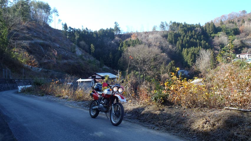 | 起点から700m程で、先ほどの合流地点に到着。おばあさんの言うとおり、この先はすぐに集落で行き止まりとなっていた。 実は、さっき合流地点でおばあさんと合う直前に、携帯に1件のメールが入っていた。差出人はTKさん。本文には「ムフフ」の3文字と雪だるまの絵文字のみ。どうやら写真を添付し忘れたようだが、その内容から、いい感じに積もった林道を走って来た様子が良く分かる(笑)。この辺りではほとんど積雪は無いが、もっと大滝寄りではそれなりに積もっているのかな。とりえず「いま合角ダムの近くにいます」と返信をしておいた。 |